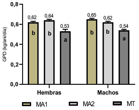 El sexo (machos y hembras) como fuente de variación individual no ejerció un efecto significativo (p>0,05) sobre los indicadores peso final y GPD (Figura 1). Sin embargo, para estas mismas variables la interacción del sexo y tipo de manejo presentó un efecto significativo (p<0,05); se encontró que GPD de terneros del mismo sexo varió significativamente entre MA1,MA2 y MT.