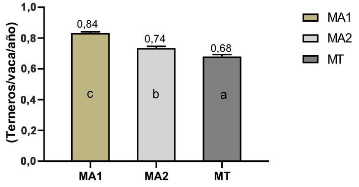 La tasa de terneros nacidos por vaca/año (TN) de las vacas del MA1 estuvo beneficiada por el destete temprano (100 días), que dio como resultado una diferencia superior de 0,10 y 0,16 terneros/vaca/año con respecto a MA2 y MT, respuesta que, además, coincidió con lo encontrado por Moreno Medina et al. (2018), quienes reportaron un incremento en la TN influenciada por el destete y secado de la vaca a los 90 días postparto. Además, el estudio realizado por Mendes Paizano Alforma et al. (2022) tuvo un incremento del 21 % en la tasa de preñez como efecto del destete a los 30 días postparto.