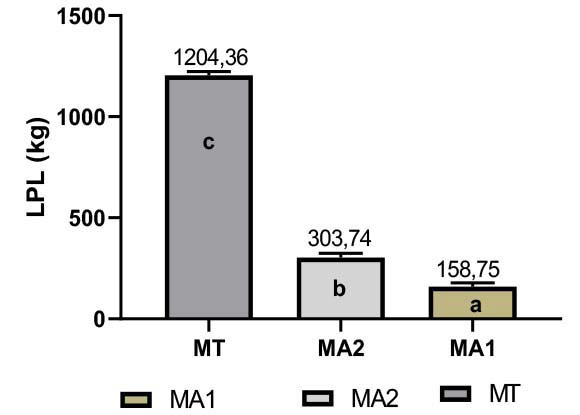 El tipo de manejo presentó un efecto sobre el volumen de la LPL (p<0,05). El MA1 generó una reducción de 1045,61 kg/vaca y 145,19 kg/vaca de la LPL comparado con MT y MA2, respectivamente (Figura 3).