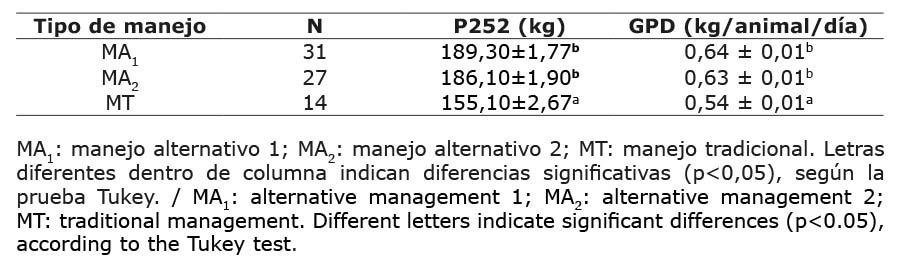 El peso final y la GPD de los terneros del MT estuvieron dentro del valor medio nacional (154,6 kg y 0,48 kg/día) para hatos con nivel de producción medio, reportado por González-Quintero et al. (2020). Sin embargo, la GPD encontrada en los grupos MA1 y MA2 fue superior a la encontrada en los terneros del MT, pero similar a 0,66 kg/día encontrado en terneros del sistema doble propósito, con tecnificación media, evaluados en el trópico mexicano (Espinosa García et al., 2018).