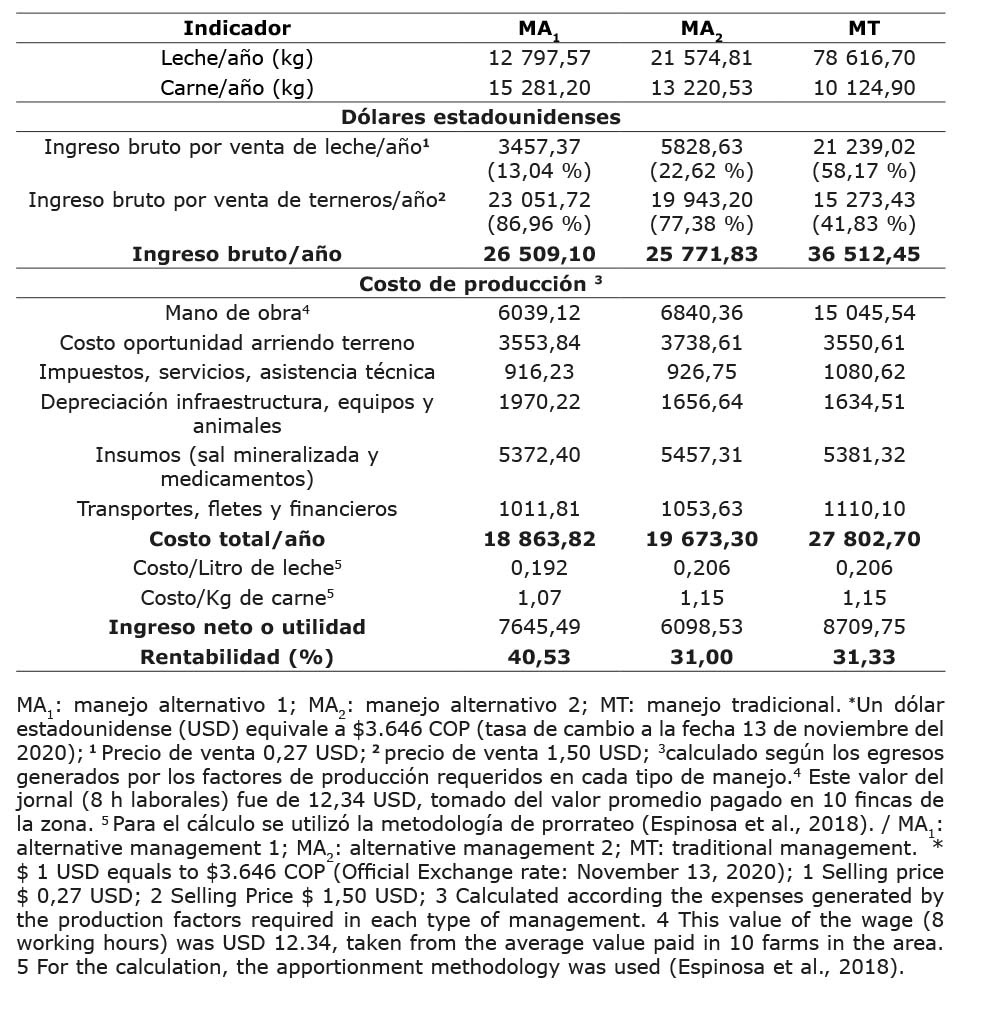 La rentabilidad obtenida con los tres tipos de manejo reflejó una inversión viable a nivel económico, pero la utilidad del MA2 (31,00 %) y MT (31,33 %) fue mayor que el 25% de rentabilidad obtenido en sistemas doble propósito, con nivel de tecnificación media, en el trópico mexicano (Espinosa García et al., 2018), similar al 20 % de margen de ganancia encontrado en hatos criollos doble propósito, de Colombia, evaluados por Parra-Cortés y Magaña-Magaña (2021). En contraste, la rentabilidad del MA1 (40,5 %) fue superior a todos los hallazgos antes mencionados, como resultado de la reducción en los costos de producción, influenciado en gran parte por menor requerimiento de mano de obra.