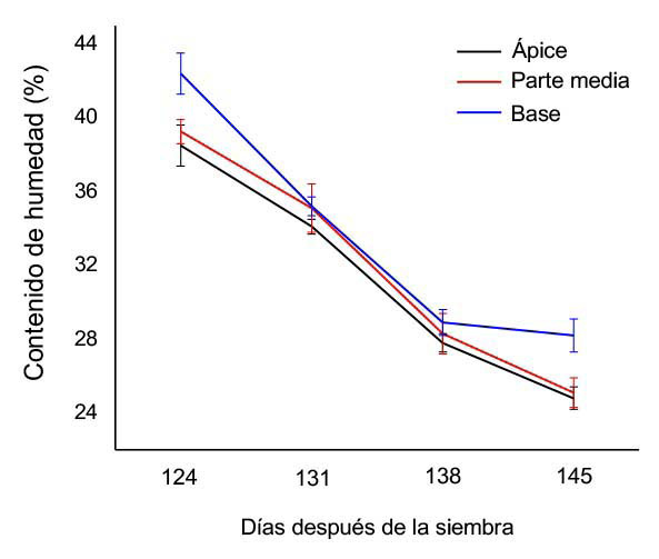 Se realizaron cuatro muestreos, el primero a los 124 días después de la siembra y luego a intervalos de siete días hasta que la semilla llegó a la madurez fisiológica (MF). Para cada muestreo se tomaron tres mazorcas al azar por triplicado, con base en la etapa fenológica y el desarrollo de las plantas, para asegurar condiciones homogéneas del material cosechado. Para realizar las evaluaciones correspondientes, se desgranaron las mazorcas de cada muestreo de forma manual y se separaron las semillas en tres estratos de acuerdo con su posición en la mazorca: ápice, parte media y base.