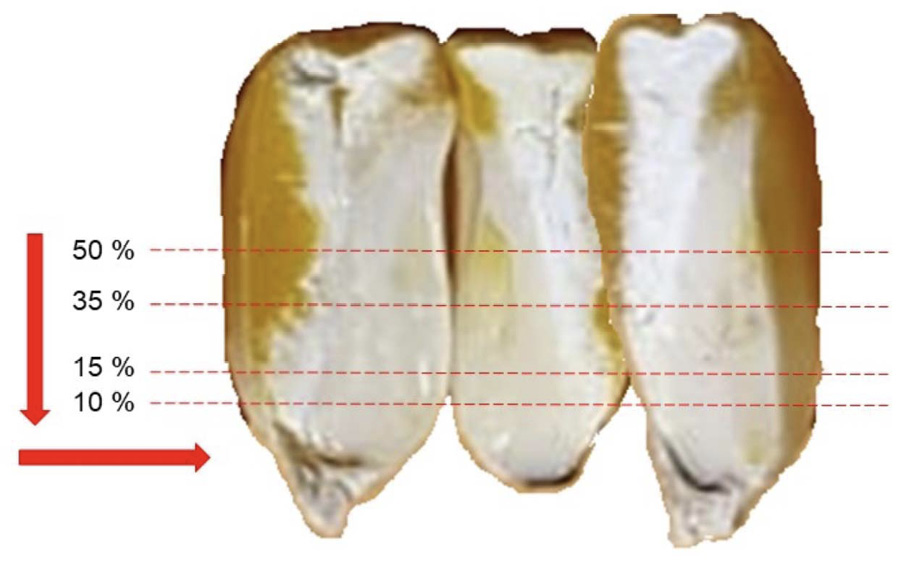 Figure 2. Milk line (solidification of the endosperm) and black layer (drying of the cells in the placenta zone of the grain) as maize (Zea mays) seed physiological maturity indicator of cv. experimental (Yellow × V-54A) F6 at the four sampling (145 days after sowing). Colegio de Postgraduados, Montecillo, Texcoco, México. Crop cycle spring-summer 2021.