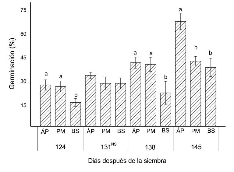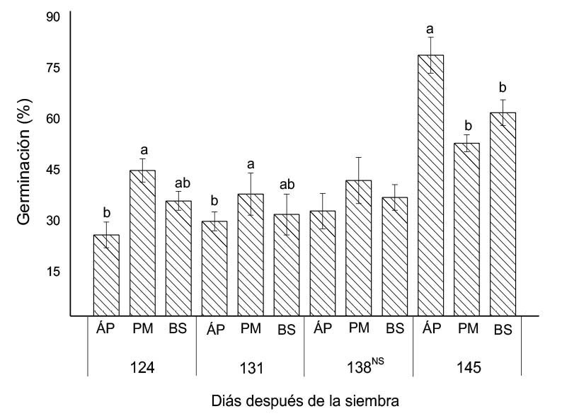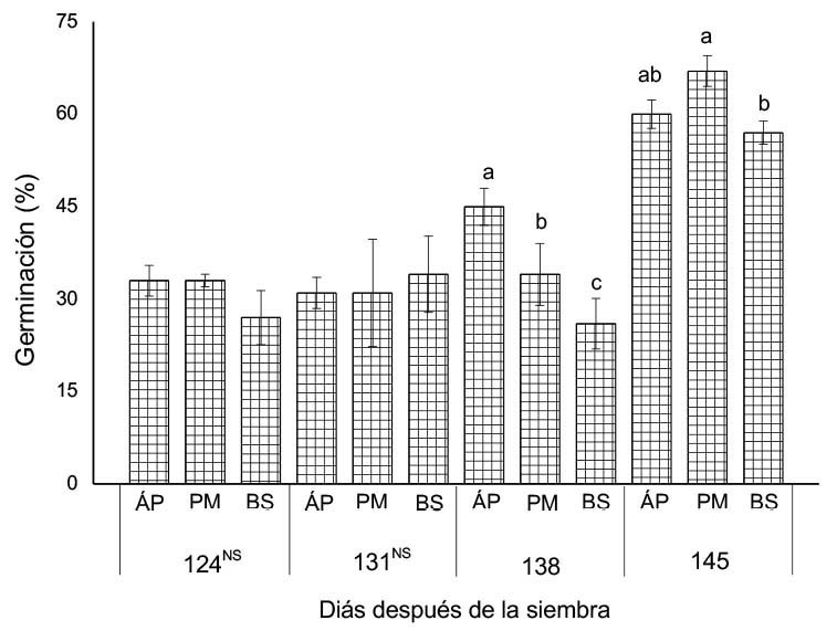 El porcentaje de germinación (PG) en la prueba de frío (PF) no presentó variaciones en el primero y segundo muestreo (p>0,05). Para el tercer muestreo (138 días después de la siembra), el estrato del ápice, con un 45 % de germinación, presentó diferencias estadísticas (p<0,05) de manera comparativa con los estratos media y base. A los 145 días después de siembra (semilla madura), la parte media presentó el mayor PG con un 67 %, respecto del ápice y la base con 60 % y 57 %, respectivamente (Figura 5).