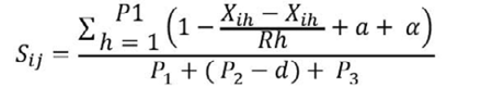 Donde Sij es el coeficiente de similaridad de Gower, P1 es el número de variables cuantitativas continuas, P2 es el número de variables binarias, P3 es el número de variables cualitativas (no binarias), a es el número de coincidencias (1, 1) en las variables binarias, d es el número de coincidencias (0, 0) en las variables binarias, α es el número de coincidencias en las variables cualitativas (no binarias), Rh es el rango (o recorrido) de la h-ésima variable cuantitativa, xih es el rango de la variable cuantitativa por eso hay un rango máximo y un rango mínimo xih - xih (Carrillo et al., 2011).