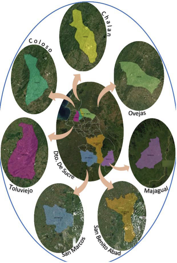 El estudio se realizó en las subregiones de Montes de María y La Mojana en el departamento de Sucre, Colombia, que comprende los municipios que tienen establecido el sistema de producción de cacao (Theobroma cacao L.), en las áreas rurales de los municipios de Chalán, Ovejas, Colosó, Toluviejo San Marcos, San Benito de Abad y Majagual (Figura 1), los cuales se seleccionaron por ser los más representativos en el establecimiento de los sistemas agroforestales que incluyen cacao, dado a las iniciativas de promover y fomentar el cultivo en esta zona caracterizada por el conflicto armado.