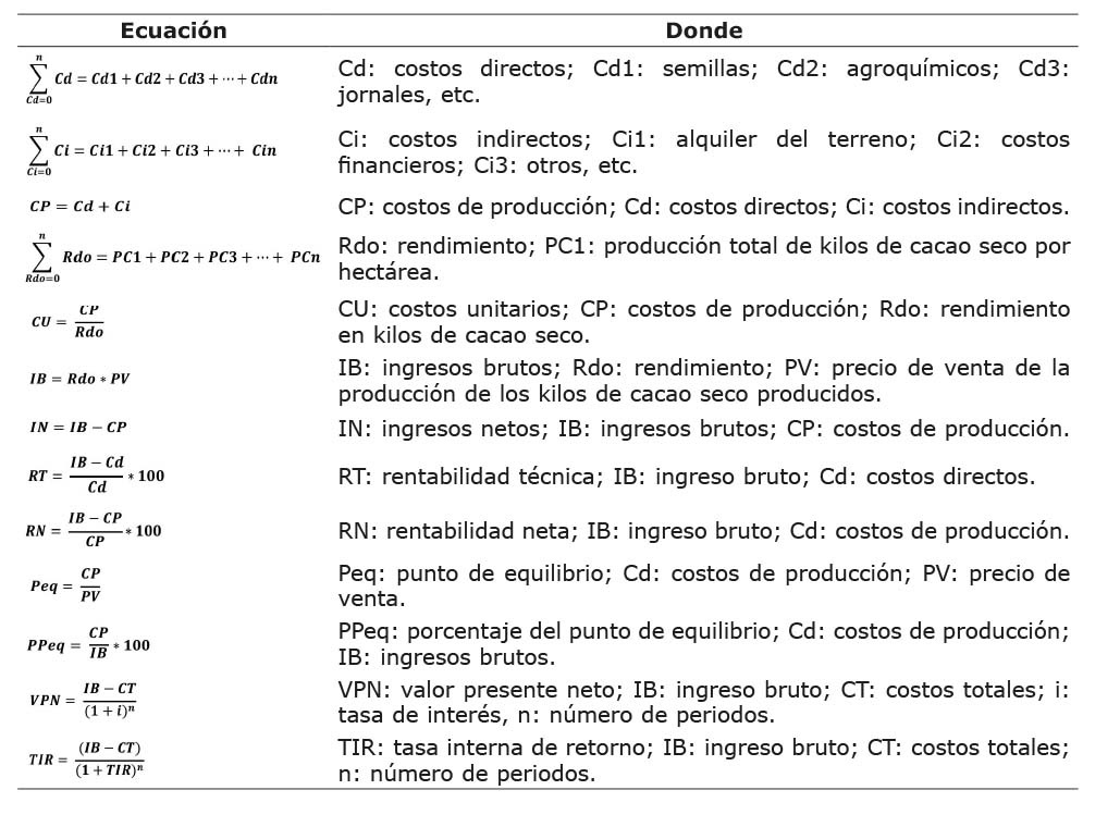 Como complemento del trabajo de caracterización del sistema de producción de cacao, se hizo la interpretación económica de la tecnología local de producción, con información obtenida por el método del consenso (Molina, 2016), además, se calcularon los indicadores de retorno (Krugman & Wells, 2006). Los parámetros y formalización de los cálculos de los retornos a la inversión se muestran en el Cuadro 1 (Martínez Reina et al., 2020).