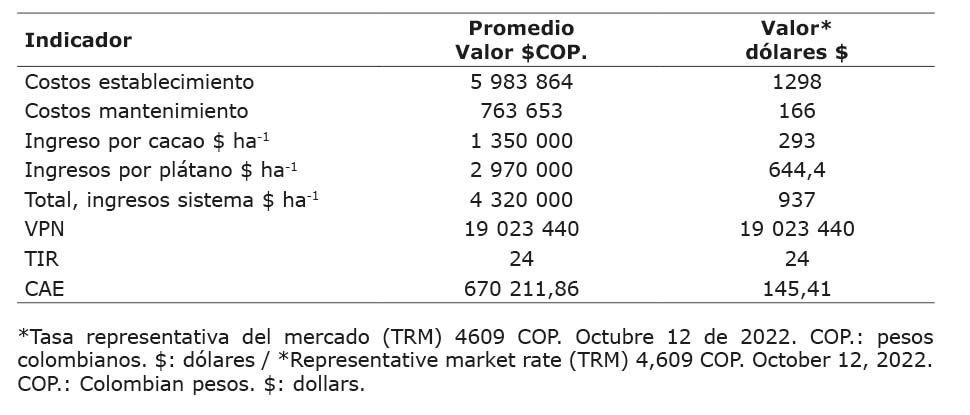 Con relación a los ingresos, estos tienen lugar por dos fuentes, la primera es la producción de plátano, el cual actúa como sombrío transitorio y forma parte de los costos de establecimiento y la cosecha ocurre a los nueve meses después de sembrado, que se calcula que al año produce US$ 645,37 dólares, los cuales solventan los costos mientras el cacao empieza a producir. Para un año donde hay producción de los dos cultivos se estima un ingreso total de US$ 937 dólares por hectárea. Con la producción de los dos cultivos y el ingreso que generan permiten recuperar los costos y por esta razón, son atractivos para el agricultor con la posibilidad de generar ingresos que superan a los costos con una tasa de retorno del 24 % superior al costo de oportunidad del capital y un costo anual por año de US$ 145,41, muy inferior al ingreso anual, lo que significa que el proyecto es una alternativa viable de inversión.