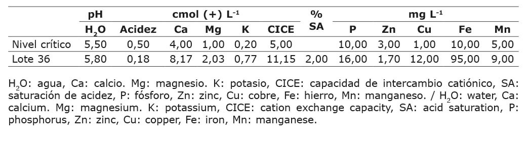 Se realizó una única fertilización a espeque, 21 días después de la siembra, a razón de 66 kg ha-1 de nitrógeno, 190 kg ha-1 de fósforo y 66 kg ha-1 de potasio.