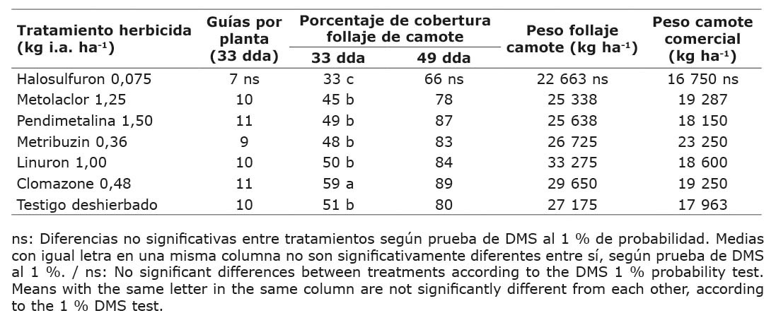 Los herbicidas metribuzin, linuron, metolaclor, pendimetalina y clomazone en las dosis evaluadas y aplicados seis días después del trasplante fueron selectivos al camote variedad Criollo, mientras que el halosulfuron causó daños leves que persistieron durante 33 días, pero ninguno de los herbicidas afectó negativamente en el rendimiento de las raíces reservantes del camote.