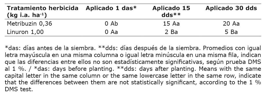 En el experimento 2 para la variable porcentaje de daño, se encontró que la interacción herbicida por época de aplicación fue significativa. Cuando el metribuzin y el linuron fueron aplicados un día antes de la siembra, no se observaron síntomas de toxicidad en las plantas de camote, mientras que en las aplicaciones hechas a los 15 y 30 días después de la siembra, el metribuzin causó mayor daño a las plantas de camote que el linuron (Cuadro 3).