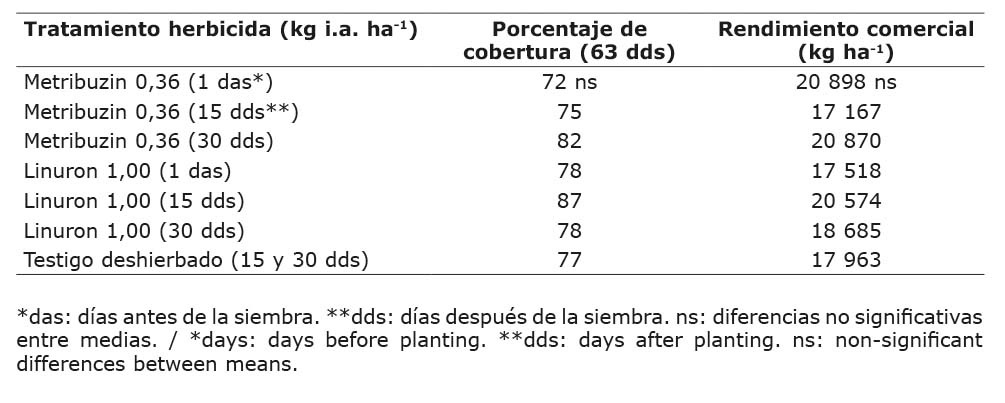 La siembra se realizó el 13 de agosto de 2021. Los tratamientos evaluados fueron: metribuzin 0,36 kg i.a. ha-1, pendimetalina 1,50 kg i.a. ha-1, clomazone 0,48 kg i.a. ha-1, halosulfuron 0,075 kg i.a. ha-1, linuron 1,00 kg i.a. ha-1, metolaclor 1,25 kg i.a. ha-1 y un testigo sin herbicidas y deshierbado a los 15 y 30 dds.