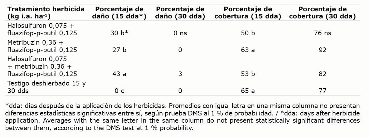 Las plantas dañadas por el halosulfuron se recuperaron, hasta no ser perceptibles los daños en la evaluación realizada a los 49 dda (0 % de daño), momento en el cual las plantas estaban recuperadas y similares al testigo deshierbado. En el resto de las parcelas que recibieron los demás herbicidas, las plantas siempre se mantuvieron sanas y con aspecto similar al testigo deshierbado.