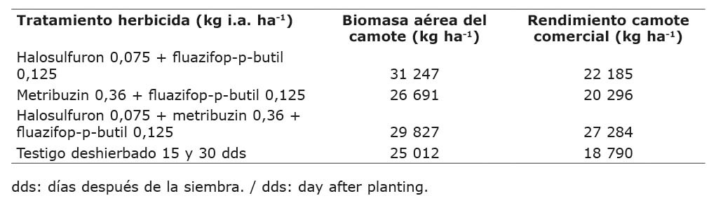 El halosulfuron o el metribuzin en mezcla con fluazifop aplicado 30 dds, causaron daños leves en las plantas de camote, sin efecto negativo sobre el rendimiento de raíces reservantes comercializables.