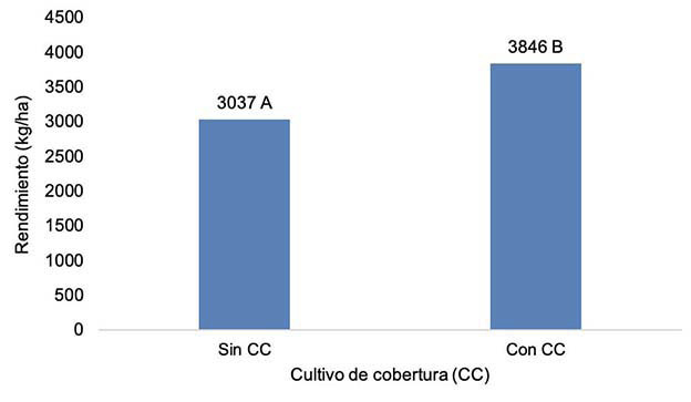 Los cultivos de cobertura (CC) aumentaron el rendimiento de grano (R) de soja en un 21 % (800 kg/ha; Figura 2).