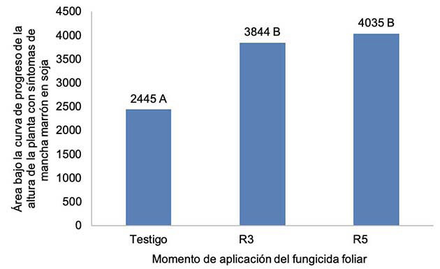 Los fungicidas foliares han demostrado su eficacia en el control de la MM cuando la misma alcanzó el umbral de acción en el cultivo (25 % de la APS; Lavilla & Ivancovich, 2021). Las aplicaciones entre R3 a R5 presentaron diferencias significativas (p≤0,05) respecto al aumento de R y reducción de la evolución de la MM en el cultivo de soja en esta experiencia. Esto se debe a que el fungicida foliar aplicado en R3 presentó una residualidad que le permitió proteger las hojas de los estratos medios y superiores de la planta de soja de infecciones de la MM durante el período crítico del cultivo (Kantolic et al., 2007). Resultados similares se han observado cuando se controló con fungicidas foliares a la mancha ojo de rana en soja entre los estados fenológicos de R1 a R5 (Roth et al., 2020). Sin embargo, los usos reiterativos de los mismos principios activos para el control de la MM podrían generar una presión de selección hacia aquellos biotipos de S. glycines resistentes a los fungicidas foliares.