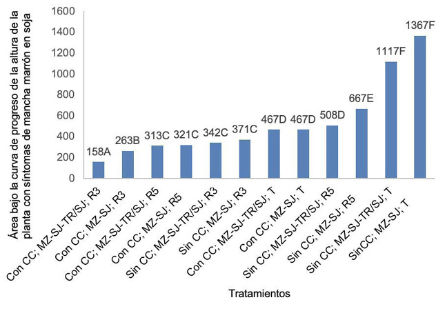 El área bajo la curva de progreso de la altura de la planta con síntomas (ABCPAPS) se redujo cuando interaccionaron las diferentes prácticas de manejo. Es por eso que se recomienda el uso combinado de estas estrategias y de esta manera fomentar el manejo integrado de enfermedades y las buenas prácticas agrícolas. Es importante considerar los efectos en el ambiente que pueden generar cada estrategia de manejo al enfrentar una enfermedad; en general, las labores culturales como los CC tienen un impacto positivo en el sistema, al alterar el patosistema S. glycines-G. max en contra del patógeno causante de la mancha marrón (MM).
