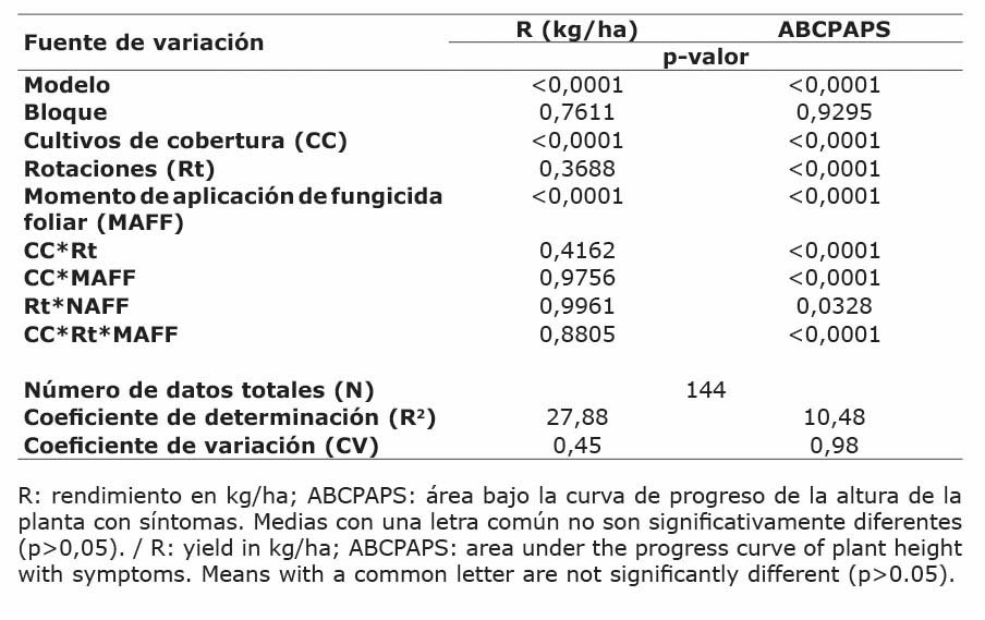 Las prácticas de manejo agronómico tuvieron un efecto significativo (p≤0,05) sobre el R y el área bajo la curva de progreso de la altura de la planta con síntomas (ABCPAPS) (Cuadro 1). Las variables CC y momento de aplicación del fungicida foliar (MAFF) son independientes y presentaron una repuesta significativa (p<0,0001) sobre el R (Cuadro 1). En cambio, hubo una triple interacción significativa (p<0,0001) entre los CC, las Rt y el MAFF para el ABCPAPS y por lo tanto, los datos serán explicados con base en estas relaciones (Cuadro 1).