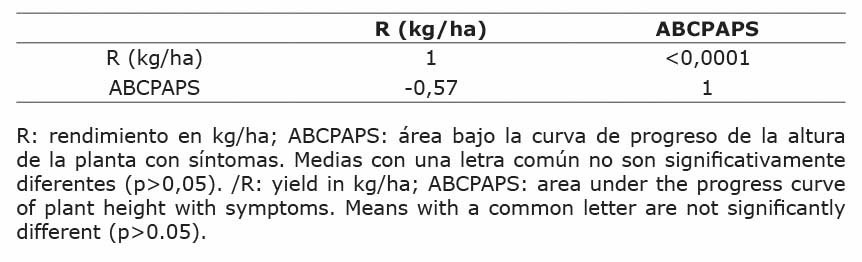 El R tuvo una correlación inversamente proporcional y estadísticamente significativa (-0,57; p<0,0001) con el ABCPAPS (Cuadro 2). Esto refuerza las ideas anteriores sobre la relación de la mancha marrón con el manejo de cultivo y su efecto sobre el rendimiento.