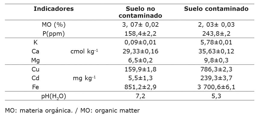 Se colectó suelo clasificado como Ferralítico rojo amarillento lixiviado típico eútrico (Hernández-Jiménez et al., 2019), en áreas donde se descargan los residuos de la Empresa cerámica blanca Adalberto Vidal de San José de las Lajas, Mayabeque, Cuba, con altos contenidos de Cu, Cd y el Fe según Falcón Rodríguez et al. (2021). Se utilizó un suelo del mismo tipo sin contaminar, recolectado en el mismo sitio alejado de la fuente contaminante, como control absoluto. Los principales parámetros químicos y físico-químico del suelo contaminado y sin contaminar se indican en el Cuadro 1.