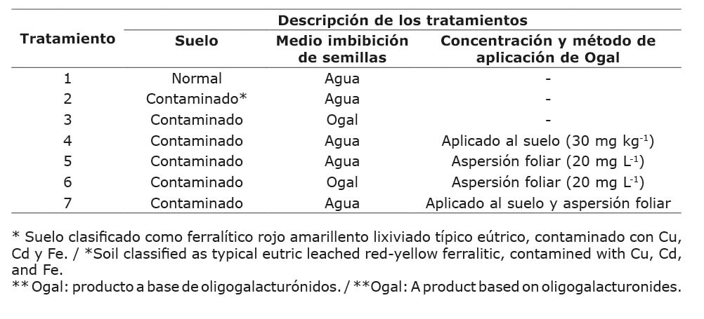 Se han utilizado reguladores del crecimiento vegetal para incrementar la velocidad de crecimiento y la producción de biomasa en plantas hiperacumuladoras (Navarro-Aviñó et al. 2007) y agentes quelantes (Pabón et al., 2020), como uno de los mecanismos de tolerancia más importante utilizado por las plantas para reducir la toxicidad por metales pesados. El Instituto Nacional de Ciencias Agrícolas de Cuba (INCA), obtuvo una mezcla de oligogalacturónidos (Ogal), que presenta una alta proporción de grupos funcionales ionizables, con un grado de polimerización (GP) entre 6 y 16, compuesta por cadenas lineales de ácido galacturónico (Mederos-Torres et al., 2011), que pudieran permitir la formación de complejos con los metales pesados. El objetivo de la investigación fue evaluar el efecto de la aplicación de una mezcla de oligogalacturónidos sobre la actividad peroxidasa y los contenidos de malondialdehido, proteínas totales y clorofilas, en plantas de tomate var. Amalia sometidas a altos niveles de metales pesados.