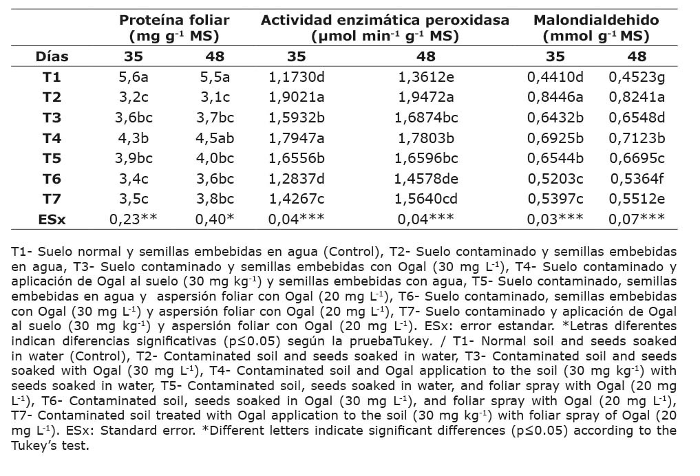 En cuanto a los niveles de malondialdehido, se evidenció que tanto a los 35 como a los 48 días, la inclusión de la mezcla de Ogal provocó que disminuyeran significativamente, en comparación con el de las plantas crecidas en el medio contaminado sin su aplicación, se obtuvieron en algunos casos valores semejantes al de las plantas en condiciones normales, para los tratamientos combinados.