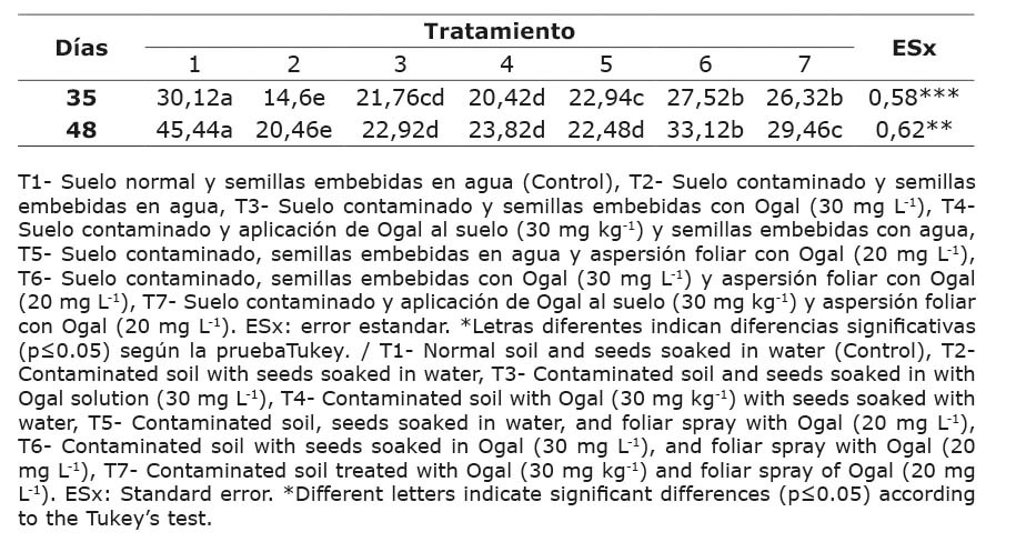 Tanto a los 35 como a los 48 días, el contenido en pigmentos fotosintéticos (Cuadro 4) se vio reducido en las plantas cultivadas en suelo contaminado sin el uso de Ogal (T2), en comparación con el tratamiento control (T1). En las plantas donde se usaron las diferentes formas de aplicación del Ogal, no se observaron diferencias significativas, donde los tratamientos en los que se aplicaron de forma combinada fueron los que mostraron las menores afectaciones.