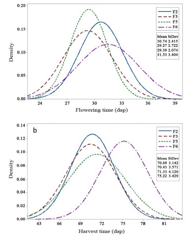 The mean values of each generation and the comparison for each observed trait are presented in Table 1. A distinct selection was observed for each trait. Flowering time increased from the F2 to F3 generations but decreased from the F5 to F6 generations. Similarly, harvest time exhibited a simiar trend. Flowering (Figure 1a) and harvest time (Figure 1b) shifted towards the left side of the graph, indicating improved traits for both flowering and harvest time, as they are correlated with early maturity.