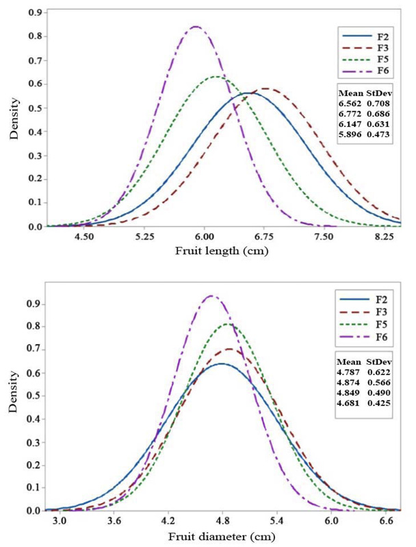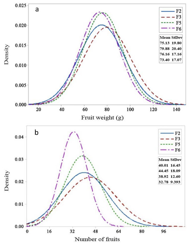 Selection responses of fruit length and fruit diameter (Figures 2a and 2b, respectively) showed an increase in the mean value in the F3 generation and subsequent decrease in F5 to F6. Similarly, fruit weight and the number of fruits (Figures 3a and 3b) exhibited an increase in the mean value in the F3 generation, followed by a decrease from F3 to F6. Variances of fruit length and fruit diameter decreased gradually from F3 to F6, while variances of fruit weight and the number of fruits increased in F3 but gradually decreased from F5 to F6 generations.
