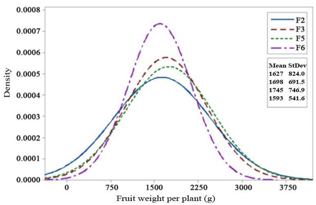 Selection response of fruit weight per plant was shown in Figure 4. The mean value of this character increased in F3 to F5, and decreased in F6 generation. On the other hand, variance of fruit weight per plant showed a gradual decrease from F3 to F6 generation.