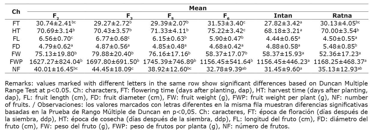 Cuadro 1. Media ± desviación estándar de los componentes del rendimiento del tomate (Solanum lycopersicum) en las generaciones F2 – F6 de 99D×Tora en comparación con las variedades Intan y Ratna. Universidad Agrícola de Bogor, Bogor, Indonesia. 2018-2019.