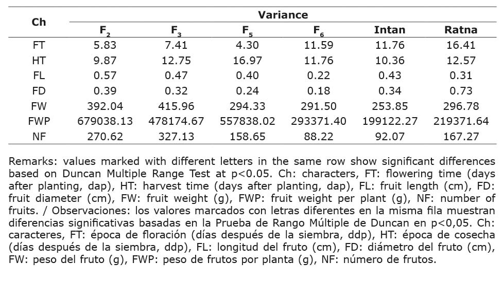 Cuadro 2. Varianza de los componentes del rendimiento del tomate (Solanum lycopersicum) en las generaciones F2 – F6 de 99D×Tora en comparación con las variedades Intan y Ratna. Universidad Agrícola de Bogor, Bogor, Indonesia. 2018-2019.