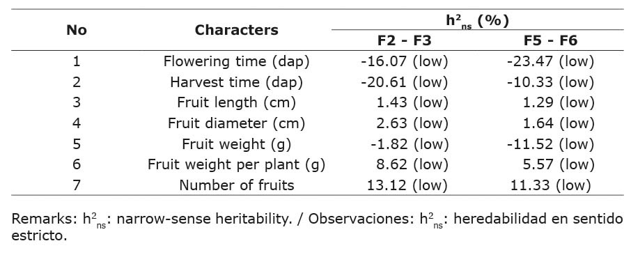 Cuadro 3. Valores de heredabilidad en sentido estricto entre F2 - F3 y F5 - F6 generaciones de tomate (Solanum lycopersicum) 99D×Tora. Universidad Agrícola de Bogor, Bogor, Indonesia. 2018-2019.