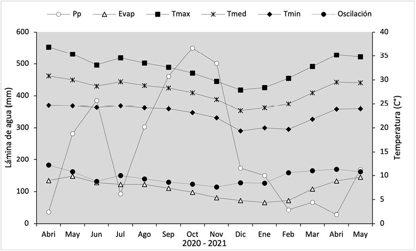 Los datos de las normales climatológicas de temperaturas (°C) máximas, mínimas y medias; precipitación (mm) y evaporación (mm), fueron obtenidos de la base de datos climatológica nacional (CLICOM). La estación corresponde al nombre de “Centro Experimental W-75” con ubicación geográfica de 18,01° latitud norte y -93,63° de longitud oeste, con una elevación de 12 m s. n. m. (Centro de Investigación Científica y de Educación Superior de Ensenada, 2021). La serie de datos correspondió de 2020 a 2021. El climograma de las temperaturas máximas, mínimas y medias, la precipitación, la evaporación mensual y la oscilación térmica de la estación climatológica, se muestran en la Figura 1.