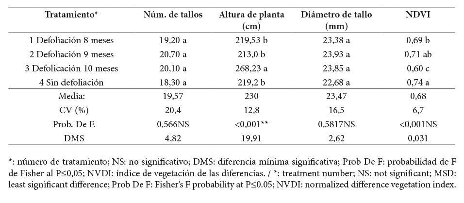 Para el número de tallos no se encontraron diferencias significativas entre los diferentes tratamientos de defoliación. El coeficiente de variación (CV) fue de 20,4 %, con una media general de 19,5 tallos/2 m (Cuadro 1). El tratamiento 2 (defoliación nueve meses), mostró el mayor número de tallos, mientras que el menor se presentó en el tratamiento 4 (sin defoliación), con 20,70 y 18,30 tallos/2 m, respectivamente.