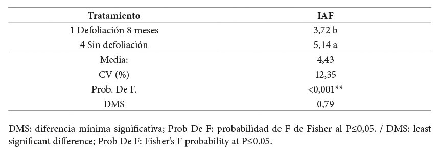 Para el índice de área foliar (IAF) se encontraron diferencias significativas (Cuadro 2). El CV fue de 12,3 % y con una media general de 4,43. En base a la comparación múltiple de medias de Tukey, se encontró que el tratamiento 4 (sin defoliación) fue el que presentó el mayor IAF con un valor de 5,14, mientras que el menor resultado se obtuvo con el tratamiento 1 (defoliación a los ocho meses), con 3,72.