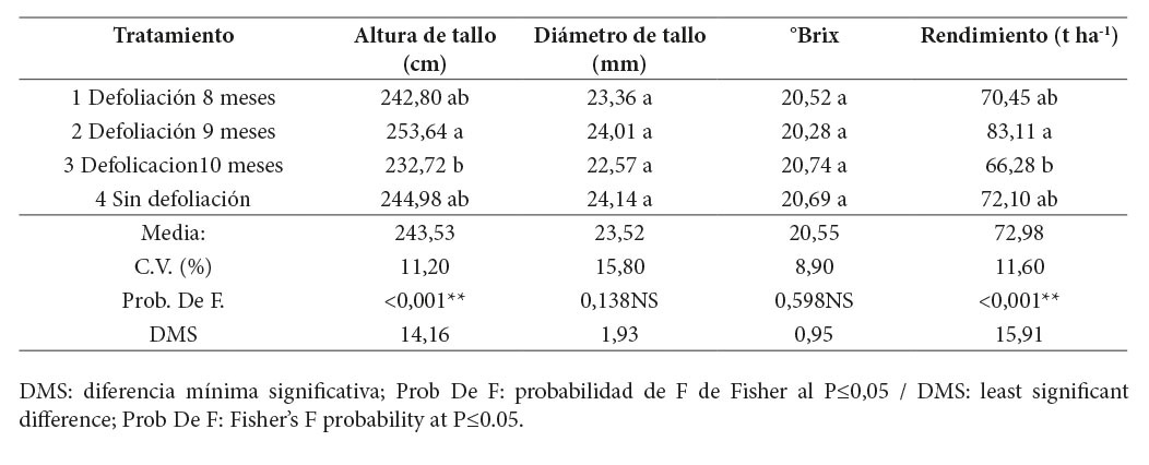 Para los °Brix, no se encontraron diferencias significativas entre los diferentes tratamientos de defoliación. El CV fue de 8,9 % y la media general de 20,55 °Brix. El mayor valor de °Brix se obtuvo en el tratamiento 3 (defoliación a los diez meses) y el menor en el tratamiento 2 (defoliación a los nueve meses). El tratamiento 3 fue el que presentó los menores valores de altura y diámetro de tallo.