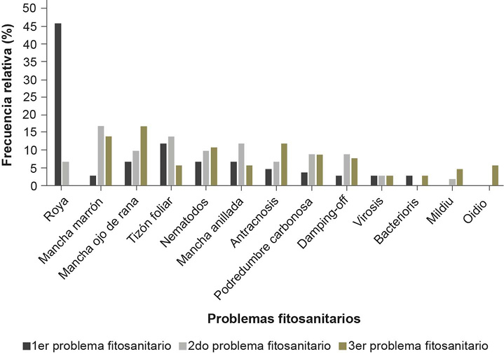 El 22 % de los entrevistados dio respuestas diversas, por lo tanto, sus respuestas fueron categorizadas en “Otros” (Figura 1). Dentro de este grupo, algunos entrevistados consideran que los problemas fitosanitarios son varios y ocurren de manera específica y que depende de varios factores, y expusieron diferentes respuestas como “enfermedades fúngicas”, “antracnosis”, “manchas foliares”, “mancha ojo de rana”, “tizón foliar”, “malezas” y “nutrición del cultivo”; también se tuvieron respuestas compuestas como “enfermedades fúngicas y malezas” y “malezas y RAS”.