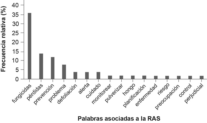 Cuando se solicitó a los entrevistados que indiquen cual es la primera palabra que viene a sus mentes al hablar de la RAS, las palabras más destacadas fueron “fungicidas” con el 36 % de las respuestas, “pérdidas” con el 14 % y “prevención” con el 12 %, seguidas por “problema”, “defoliación”, “alerta”, “cuidado”, “monitorear”, “hongo”, “planificación”, “enfermedad”, “riesgo”, “preocupación”, “pulverizar”, “control” y “perjudicial” (Figura 3).