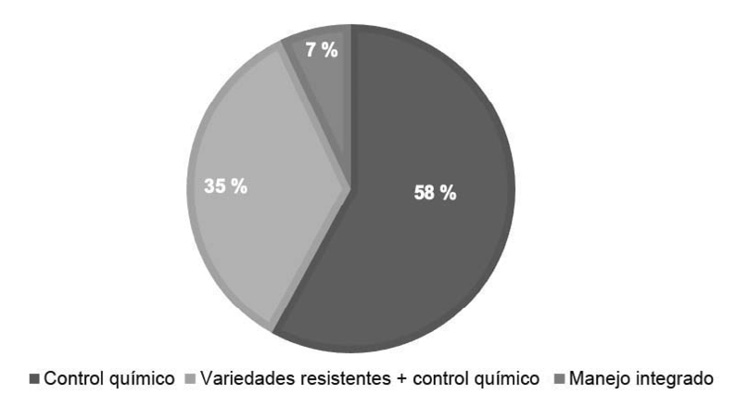 Con respecto a la forma de control de la RAS por parte de los agricultores, el 58 % realiza control químico con fungicidas, el 35 % combina el uso de variedades resistentes con el control químico, mientras que el 7 % realiza un manejo integrado del cultivo (Figura 4).