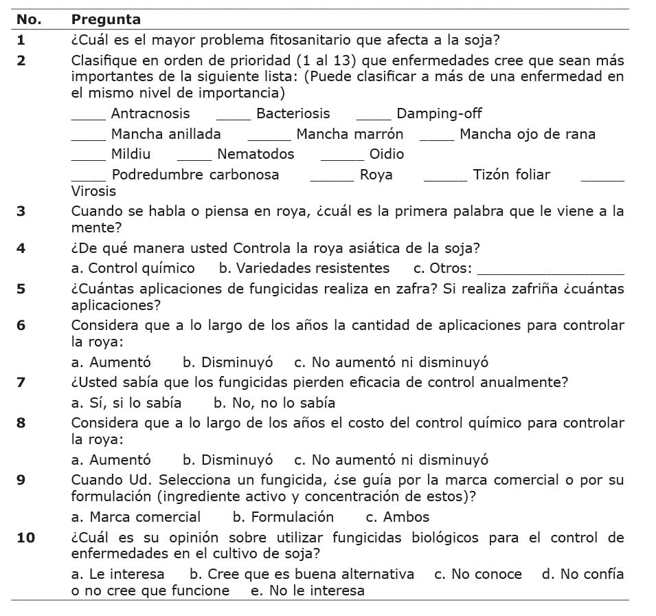 Se utilizó un cuestionario con preguntas abiertas y cerradas de selección múltiple, con la finalidad de relevar información sobre la percepción de los participantes acerca de las enfermedades más importantes que afectan a la soja, las prácticas actuales de aplicación de fungicidas, la percepción del costo y cantidad de aplicaciones, el interés en el uso de fungicidas biológicos y la pérdida de eficacia de los productos químicos (Cuadro 1).