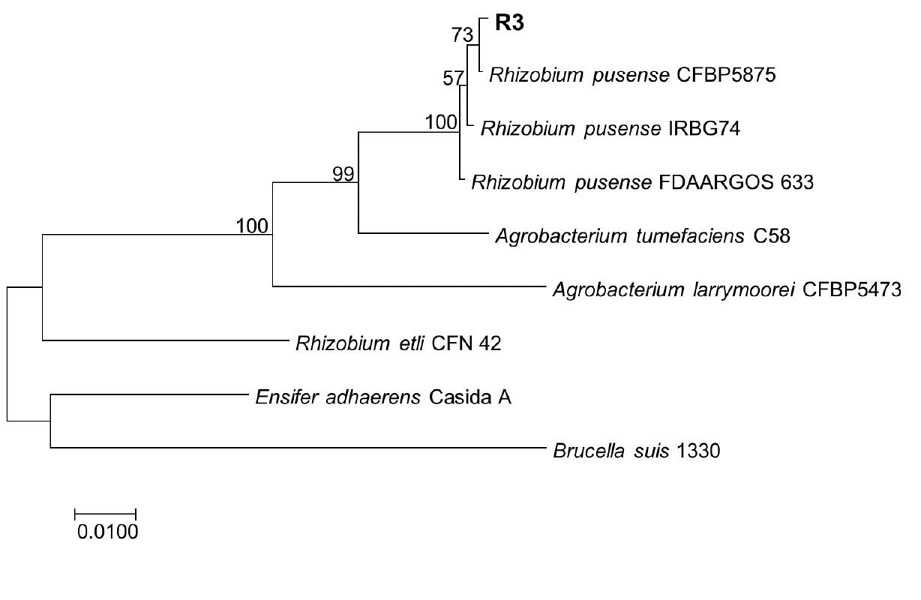 El análisis filogenético mostró que la cepa R3 pertenece al género Rhizobium y a la especie pusense. El mismo, es originario de la India y se aisló por primera vez de la rizosfera de garbanzo, de ahí que sea posible su presencia asociada a esta especie vegetal bajo las condiciones de Cuba, aunque este constituye el primer informe en el país que demuestra su presencia en el cultivo.