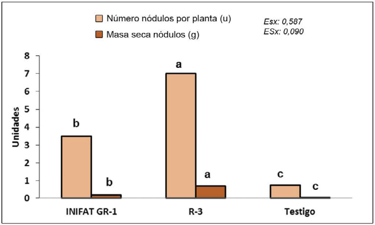 La mayor cantidad de nódulos formados con la inoculación de R. pusense cepa R3, sugiere una mayor afinidad entre esta cepa y el cultivar de garbanzo Nacional 29 y, por lo tanto, una mejor colonización del sistema radical y establecimiento de los bacteroides dentro de los nódulos, lo que conlleva a un incremento de la masa nodular (Velázquez et al., 2017). Ello implica un mayor suministro de N a la planta, que, junto a otros nutrientes y agua, se convertirán en biomasa aérea, por tanto, en mayor capacidad de realizar fotosíntesis, lo que permitirá una mayor producción de legumbres y granos. Respecto a esto, otros estudios plantean la posibilidad de lograr una nodulación eficiente garantiza los elementos necesarios para el crecimiento y el desarrollo de las plantas (Chandra et al., 2018).