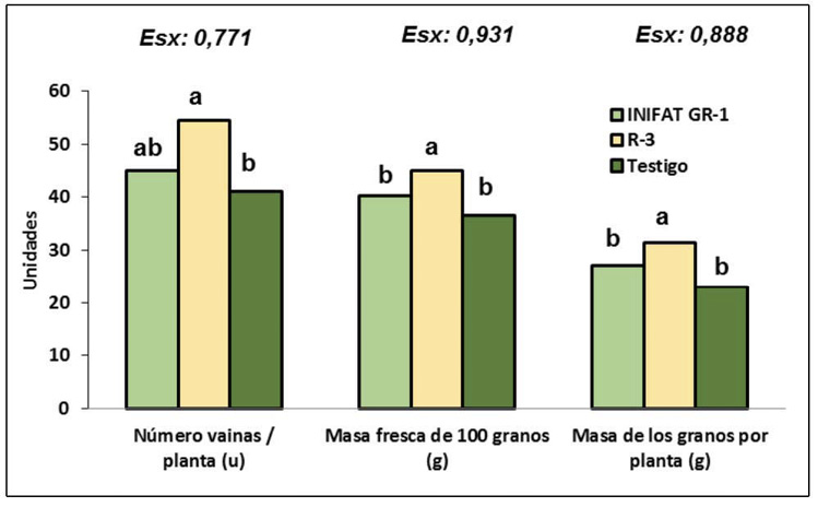 Figure 3. Number of pods per plant, fresh mass (g) of 100-grain and dry mass (g) t of grains per plant in chickpea (Cicer arietinum L.) plants of variety Nacional-29, inoculated or not (control). Cuba. 2020.