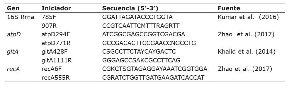 La amplificación de los genes ARNr 16S, atpD, gltA, y recA (Cuadro 1) se realizó por la Reacción en Cadena de la Polimerasa (PCR, por sus siglas en inglés) en un termociclador (SelectCycler). Se utilizaron los iniciadores 27f (secuencia 5’-AGA GTT TGA TCM TGG CTC AG -3´) y 1492r (5´- CGG TTA CCT TGT TAC GAC TT -3´) (Rasheed et al., 2020). La mezcla de reacción consistió en: 2 µL de cada cebador a una concentración de 10 µM, 25 µL de DreamTaq Green PCR Master Mix (2X); 4,0 µL de ADN y 17 μL de agua ultra pura. Para la PCR se empleó un termociclador con la siguiente programación: una desnaturalización inicial a 95 ºC, 5 min; 30 ciclos de 95 ºC, 30 s (desnaturalización); 59 ºC, 30 s (hibridación o alineamiento) y 72 ºC, 90 s (extensión), y una extensión final a 72 ºC, 7 min.