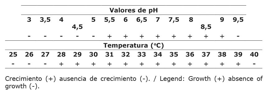 El aislado no creció a valores de pH entre 3 y 5 ni a pH de 9,5. No obstante, mostró crecimiento a pH entre 5,5 y 9,0. Tampoco creció a valores de temperatura entre 25 y 27 ºC, ni a 40 ºC. Sin embargo, toleró rangos desde 28 hasta 39 ºC (Cuadro 2).