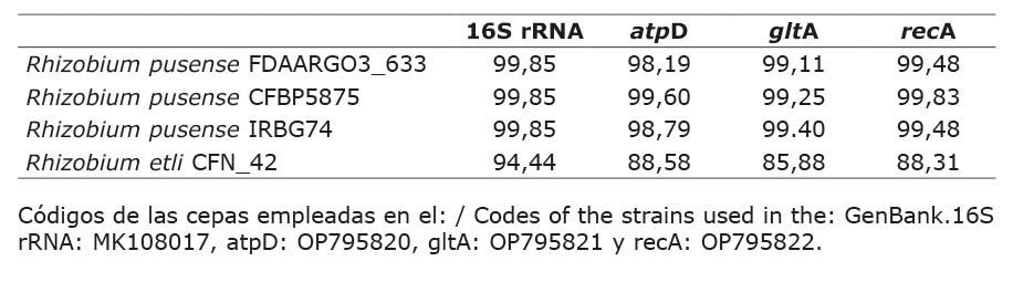 En el árbol filogenético de la cepa R3 con la secuencia de los cuatro genes (Figura 1), la cepa se identifica como perteneciente a la especie Rhizobium pusense. Los porcentajes de identidad entre las cepas de las diferentes especies de Rhizobium se indican en el Cuadro 3.
