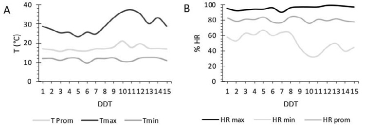 Figure 1. Temperature conditions (A) and relative humidity (B) under semi-controlled conditions during the evaluation period of the physiological response of Solanum phureja at the Obonuco Research Center, Corporación Colombiana de Investigación Agropecuaria, Pasto, Nariño, Colombia, 2019-2020.
