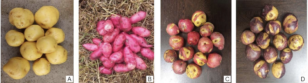 Figure 2. Solanum phureja genotypes under study: Criolla Colombia (A), Ratona Morada (B), Mambera (C), and Morasurco (D) at the Obonuco Research Center, Corporación Colombiana de Investigación Agropecuaria, Pasto, Nariño, Colombia, 2019-2020.