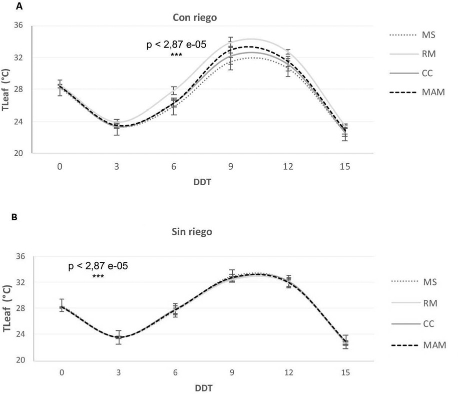 Fue posible evidenciar que entre los días 9 y 12 DDT, se presentaron las temperaturas ambiente más altas durante la evaluación. Para Tleaf los mayores valores se dieron en el día 9 (DDT) en plantas con riego, donde Ratona Morada alcanzó 33,93 °C y Mambera 32,98 °C; mientras que para plantas sin riego el mayor valor fue para Morasurco con 32,97 °C. Los menores valores de Tleaf se dieron el día 15 (DDT), para Morasurco con riego y Ratona Morada sin riego con 22,51 °C y 22,62 °C, respectivamente. Además, se identificó que las plantas bajo estrés homogenizaron el comportamiento de la Tleaf, caso contrario a lo sucedido en plantas con riego, donde el comportamiento varió entre cultivares (Figura 3).